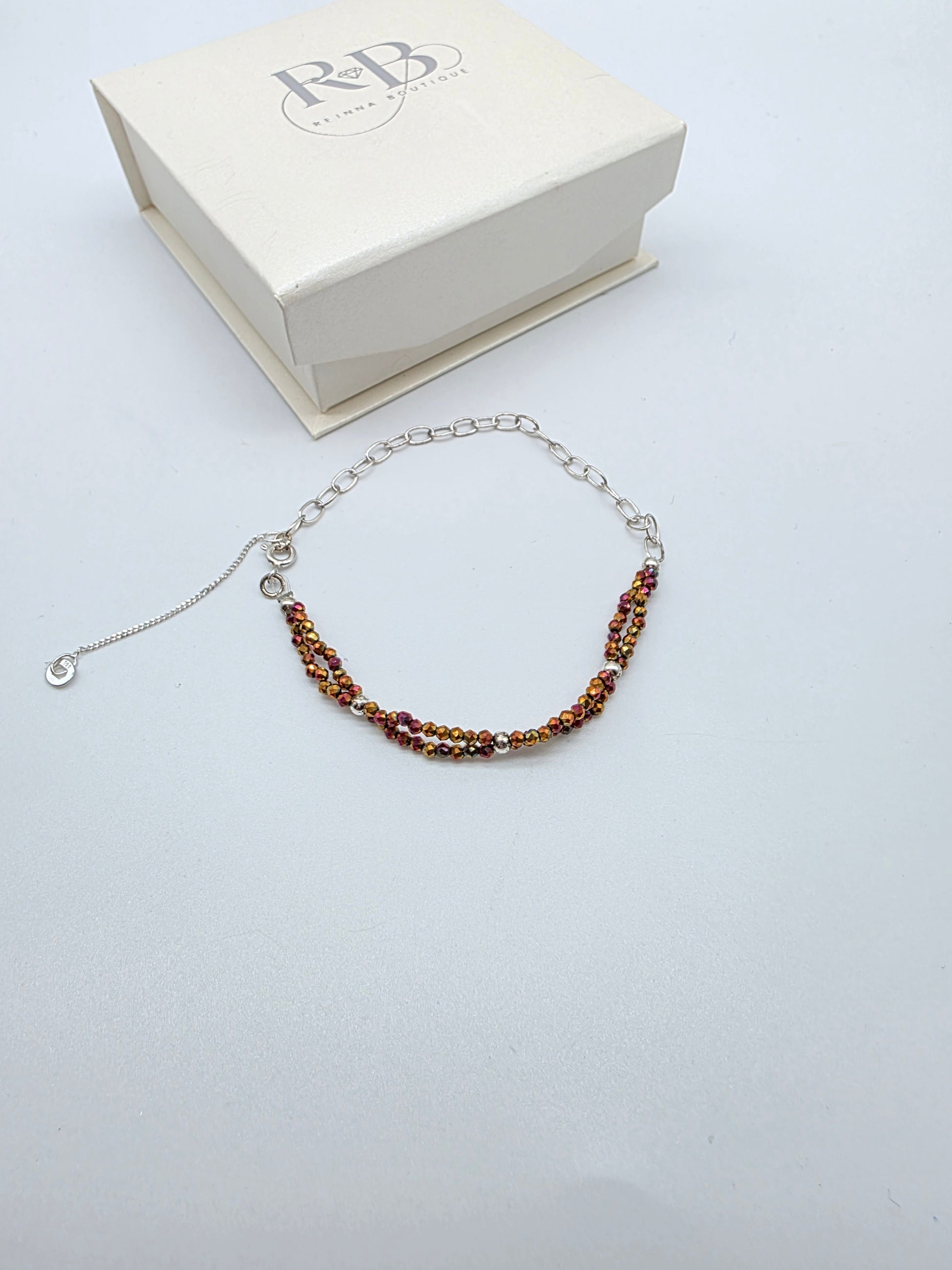 Detta handgjorda armband kombinerar glittrande kristaller i varma, kopparfärgade nyanser med fem silverkulor i silver 925, vilket ger en elegant och exklusiv känsla.