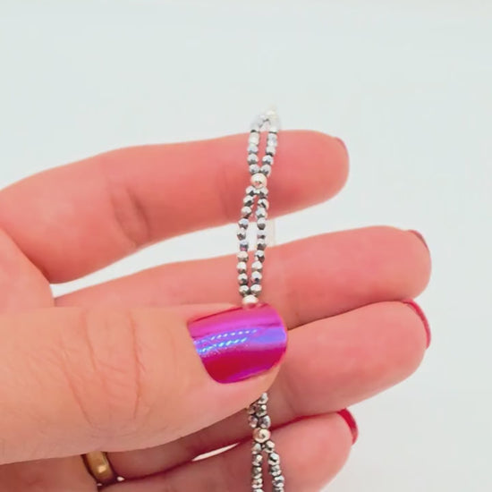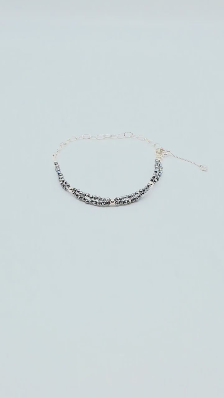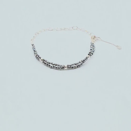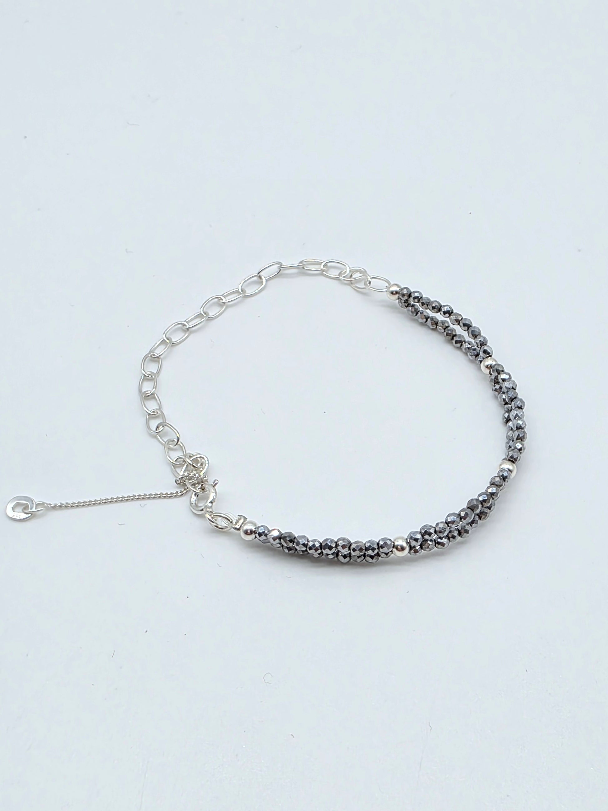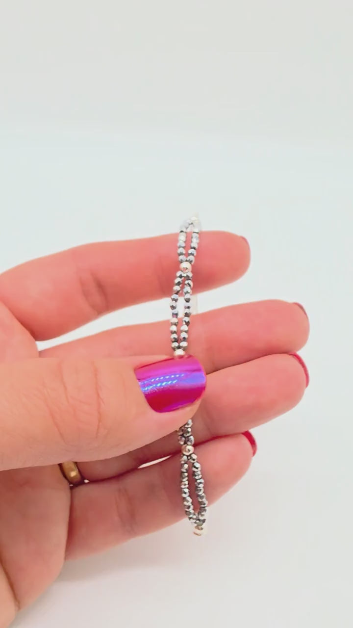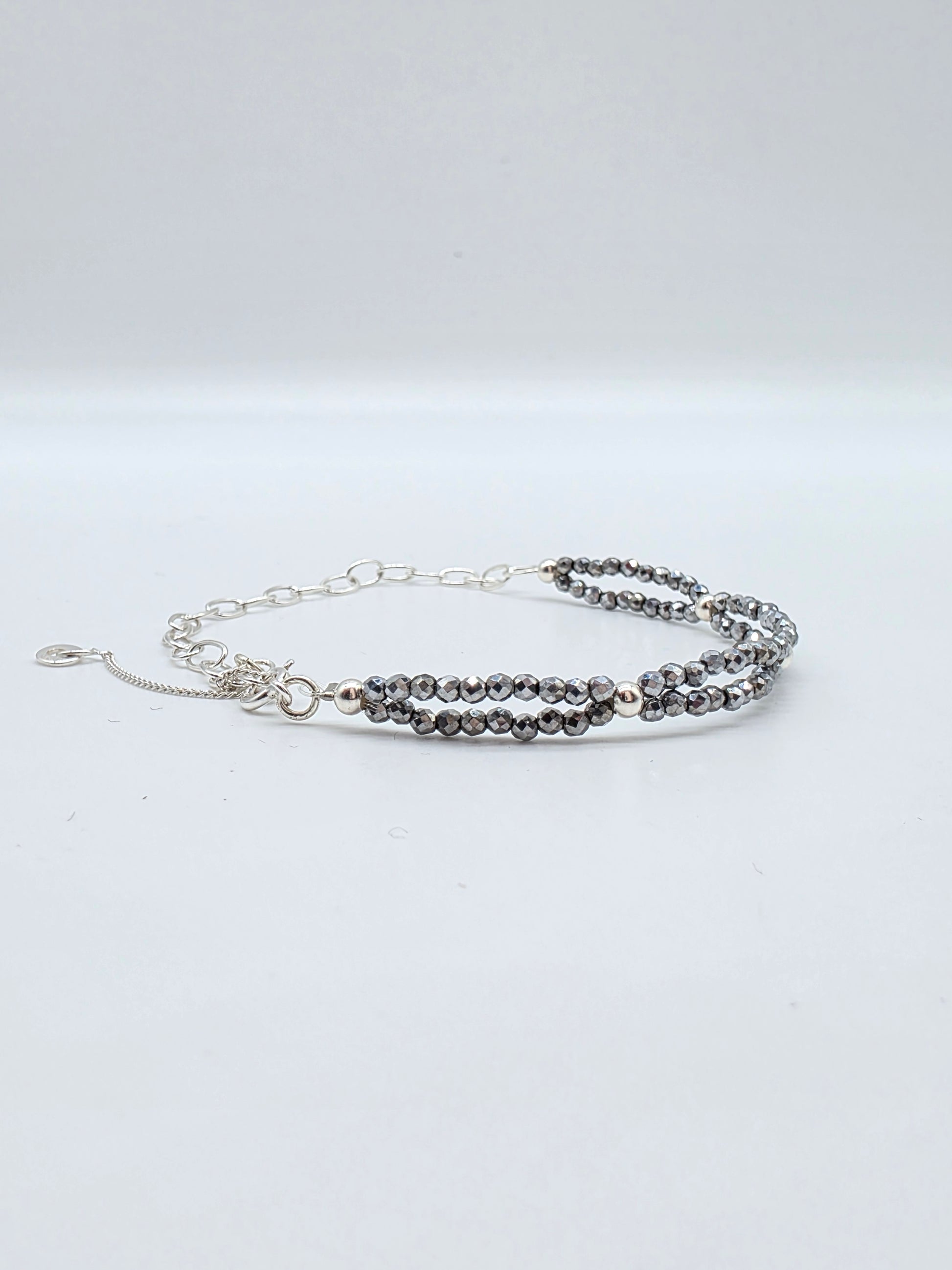 Detta eleganta, handgjorda armband kombinerar gnistrande grå facetterade kristaller med små silverkulor i silver 925. Kristallerna är placerade i två parallella rader, vilket skapar en sofistikerad och stilren look som passar lika bra till vardag som till fest.