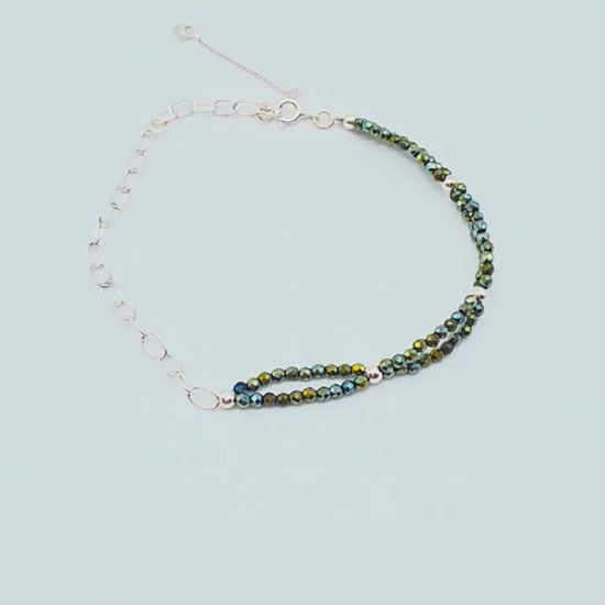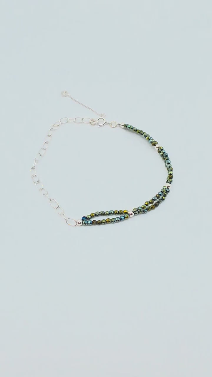 Detta handgjorda armband kombinerar gnistrande facetterade kristaller i skimrande gröna nyanser med små silverkulor i silver 925. Kristallerna är placerade i två parallella rader, vilket skapar en elegant och modern design med extra lyster.