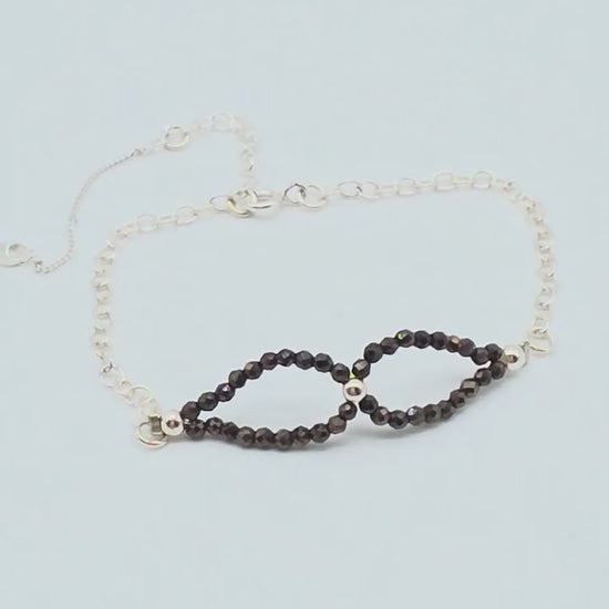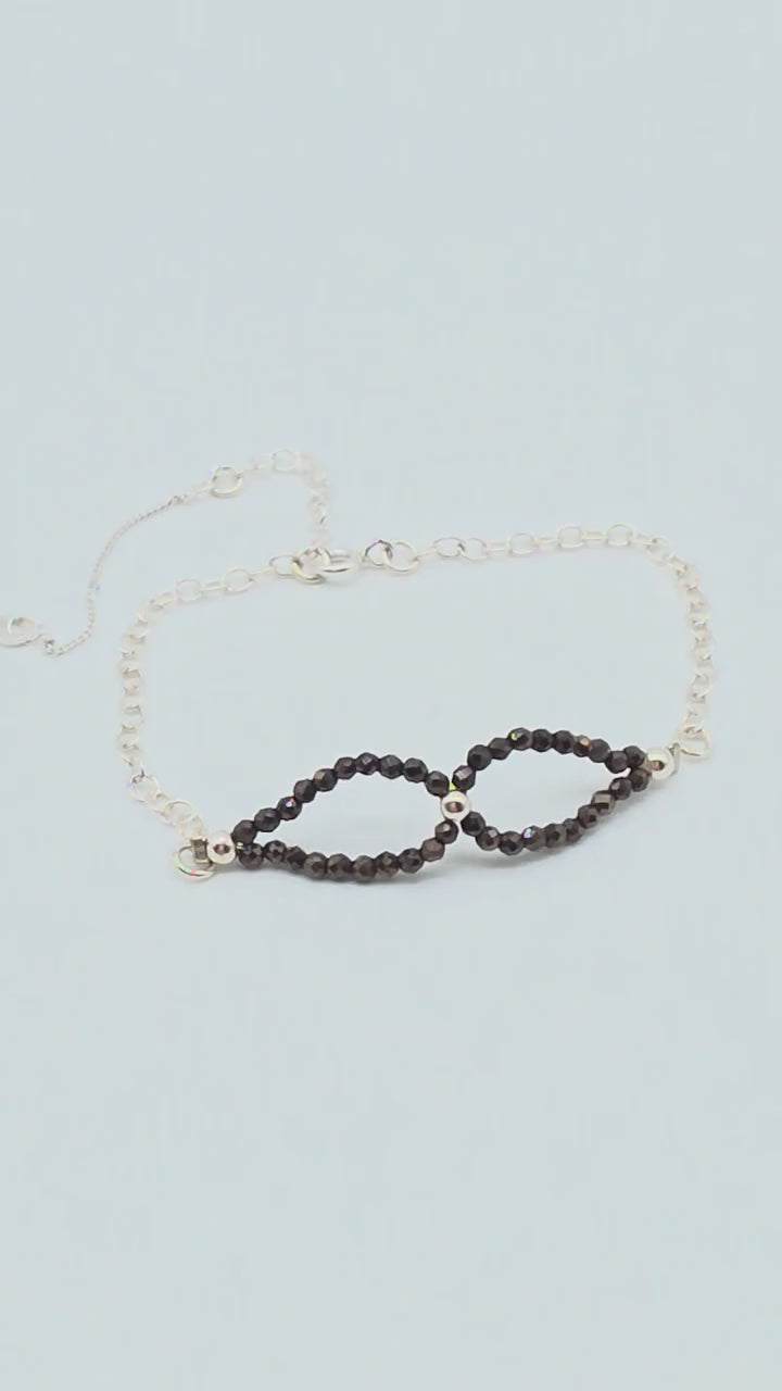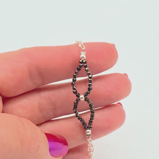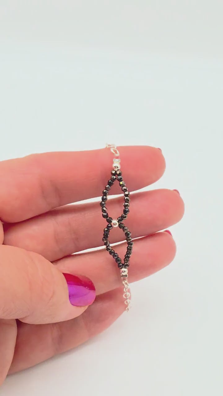 Detta handgjorda armband kombinerar gnistrande svarta kristaller med eleganta detaljer i silver 925
