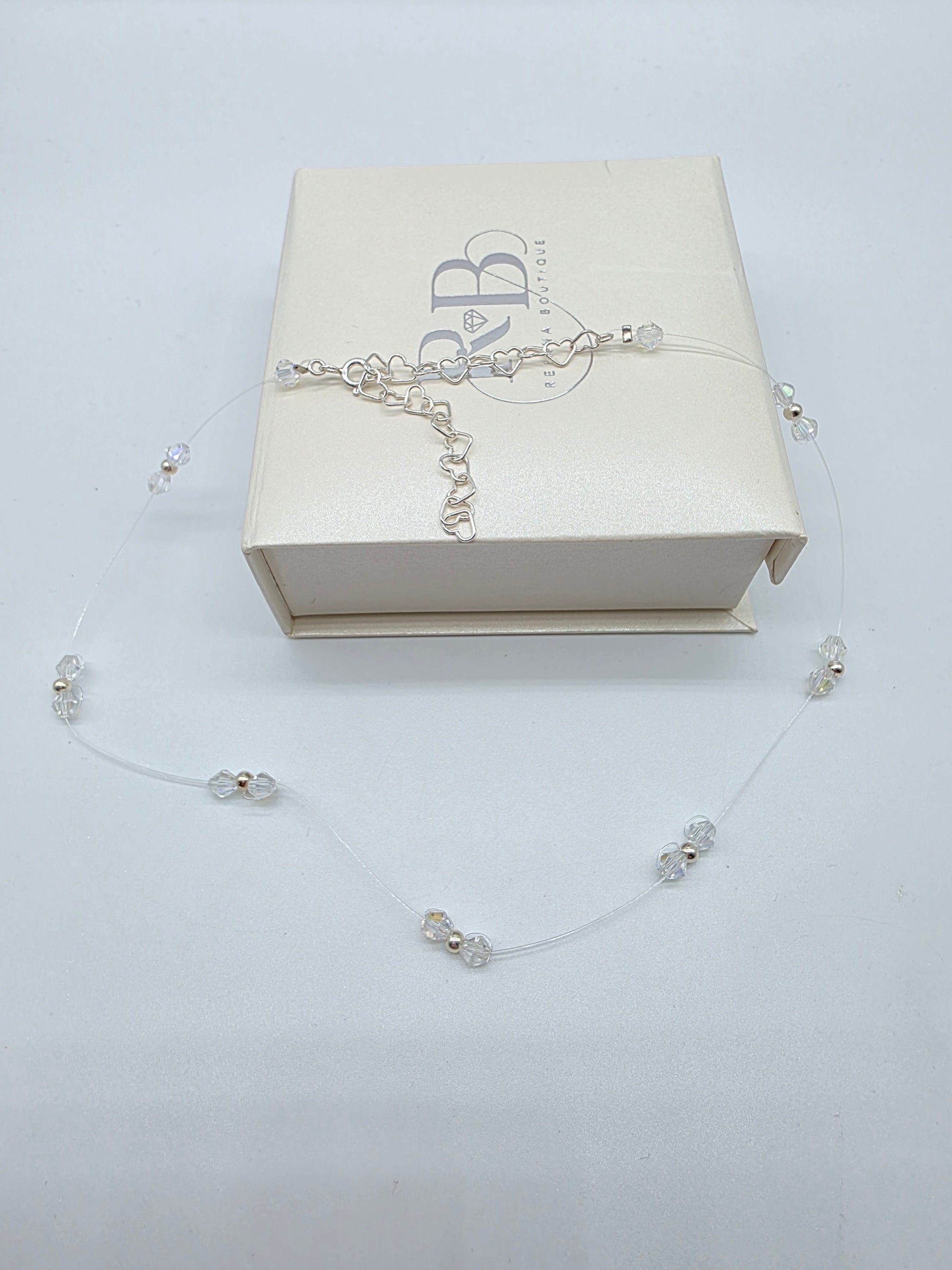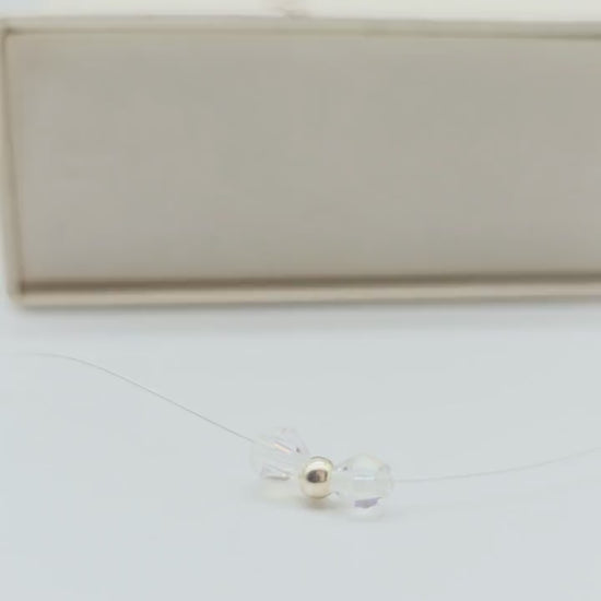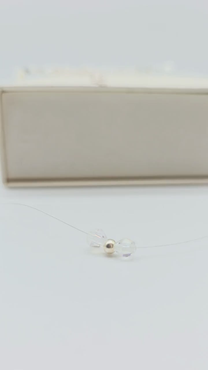 Detta handgjorda halsband har en elegant floating design, där klara kristaller i glas och små silverkulor verkar sväva lätt runt halsen