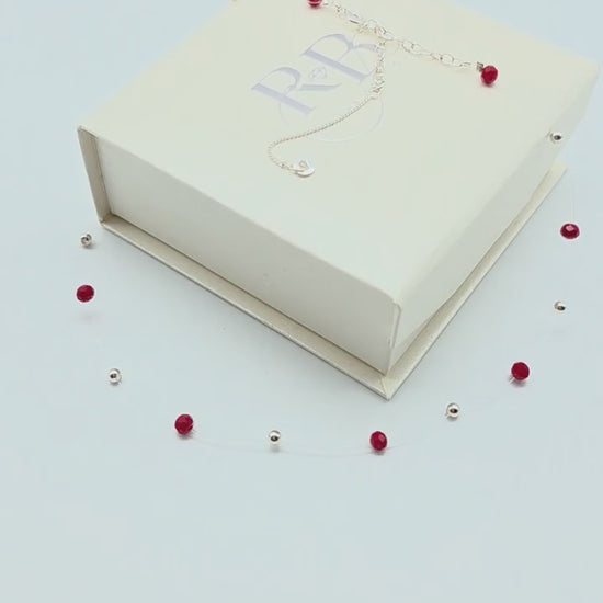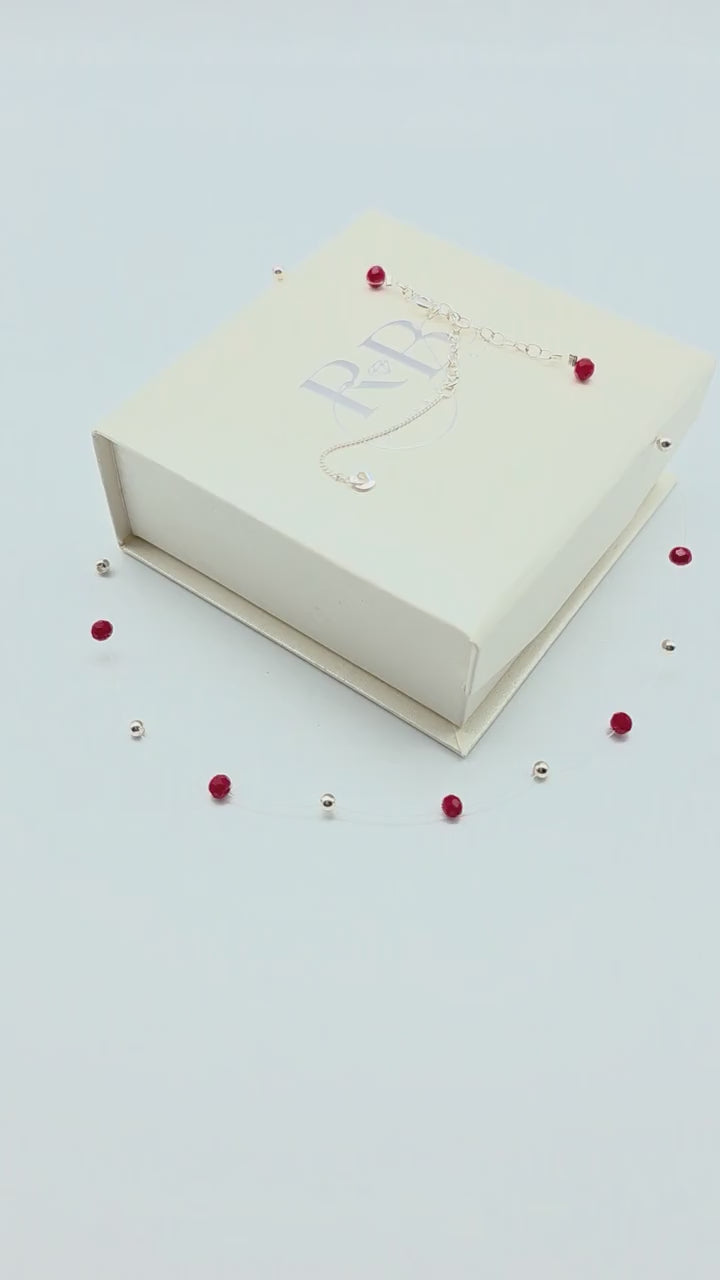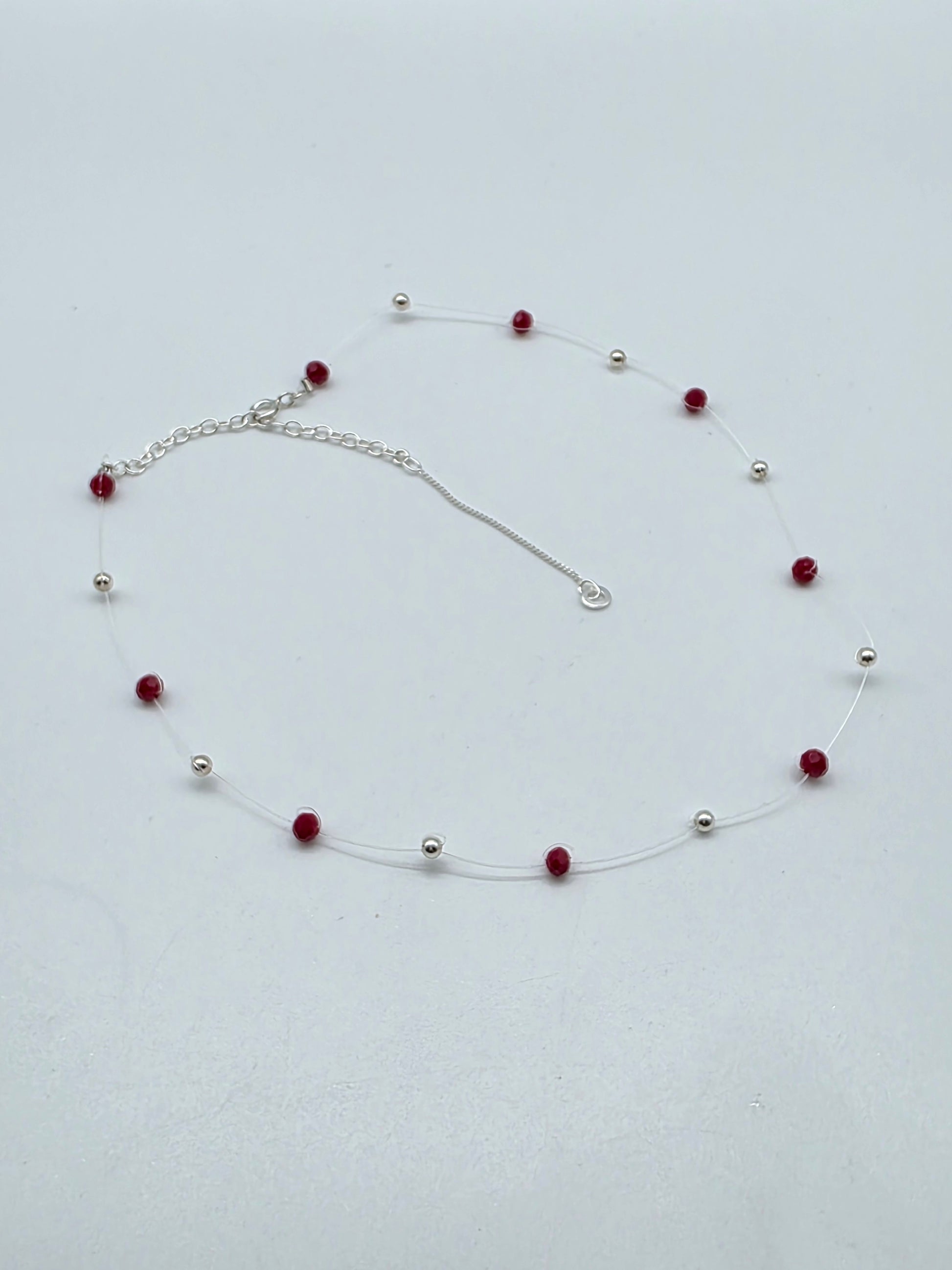 Detta handgjorda halsband kombinerar gnistrande vinröda kristaller med åtta silverkulor i silver 925, placerade på en tunn transparent tråd i en elegant floating design. Kombinationen av det djupa vinröda och det glänsande silvret skapar en sofistikerad och tidlös look som passar lika bra till vardag som till fest ✨