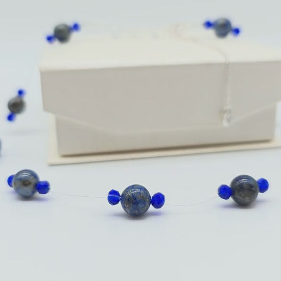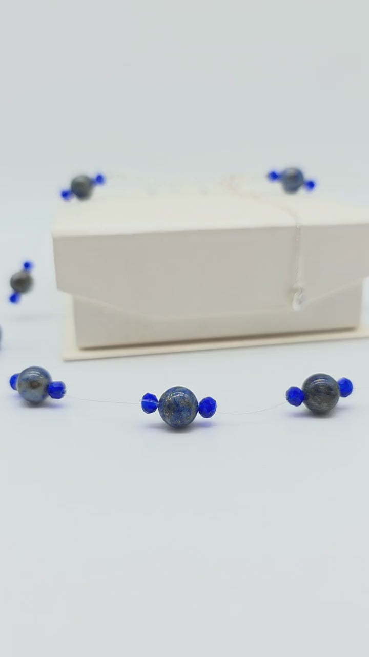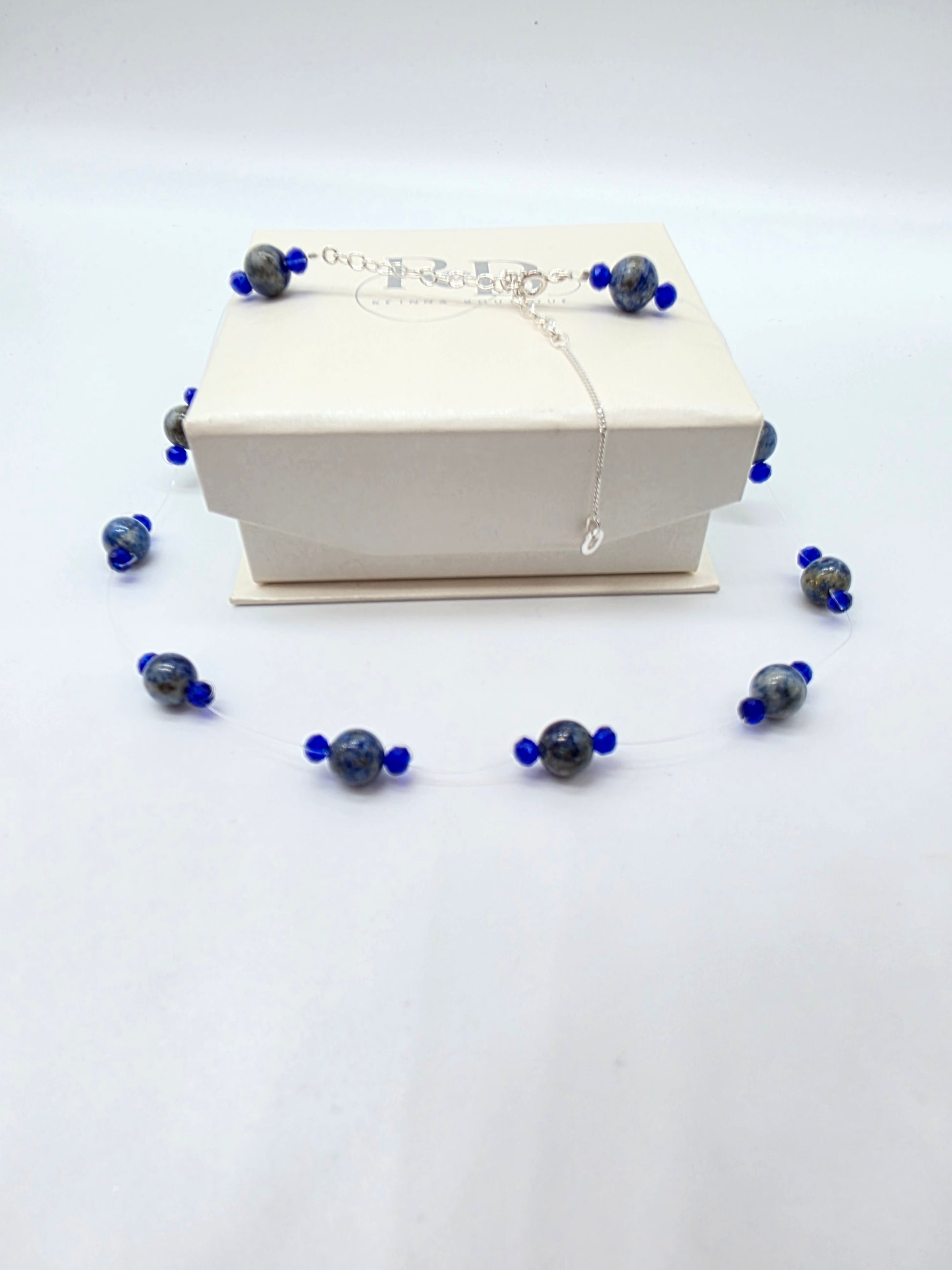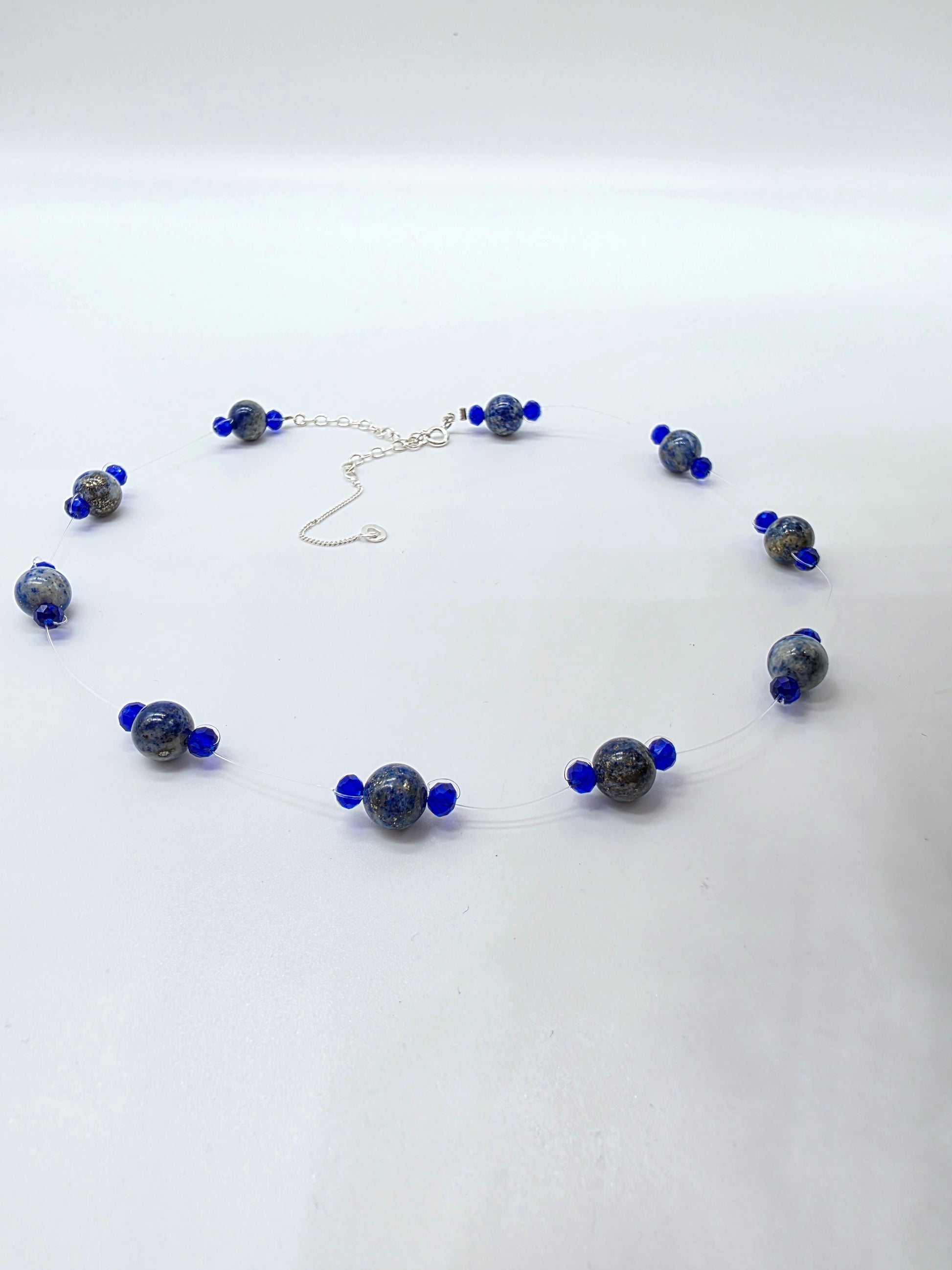 Detta eleganta halsband har en modern floating design med naturliga stenar (6 mm) i blågrå nyanser och blå facetterade kristaller.