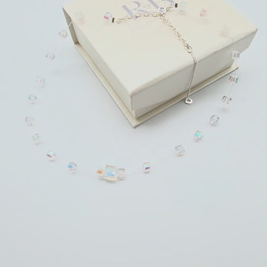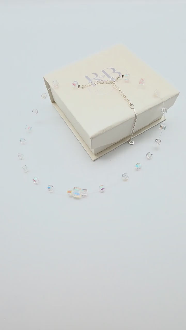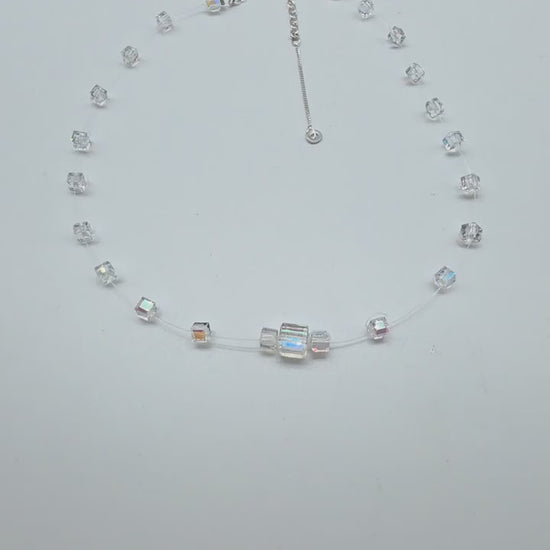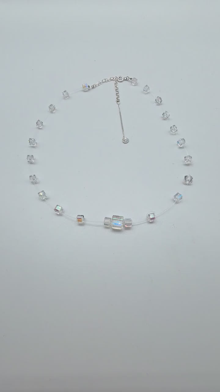 Detta handgjorda halsband har en modern och elegant floating design med klara glaskristaller i olika geometriska former. Kristallerna är placerade på en tunn transparent tråd som skapar en lätt, svävande effekt runt halsen och reflekterar ljuset på ett subtilt och sofistikerat sätt ✨