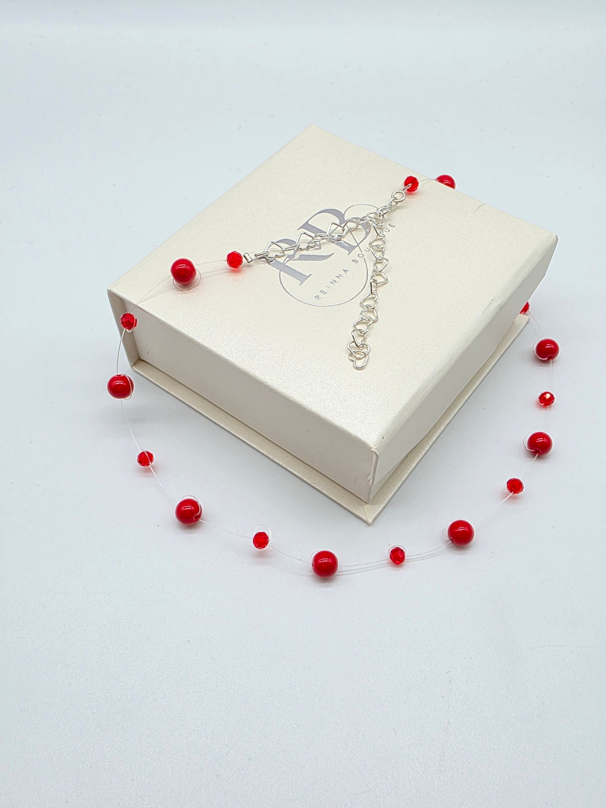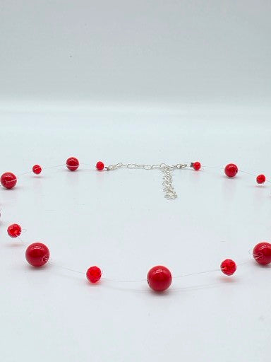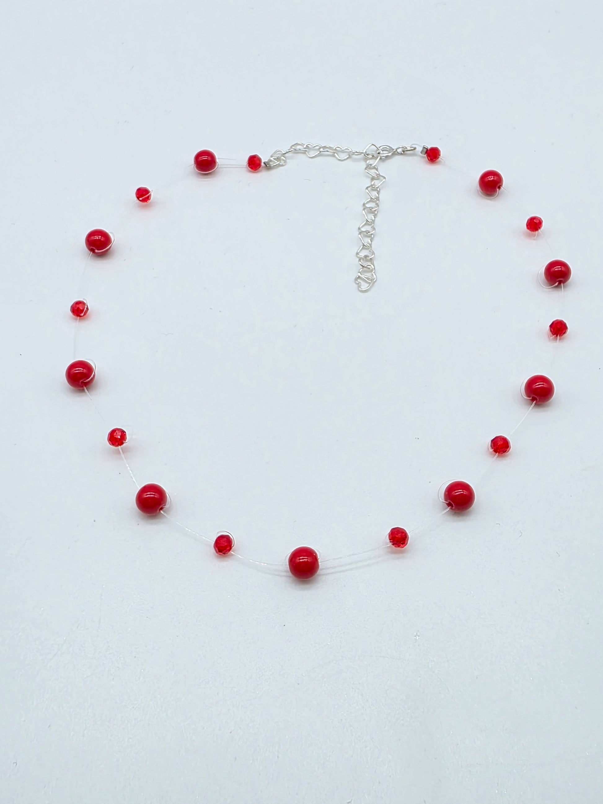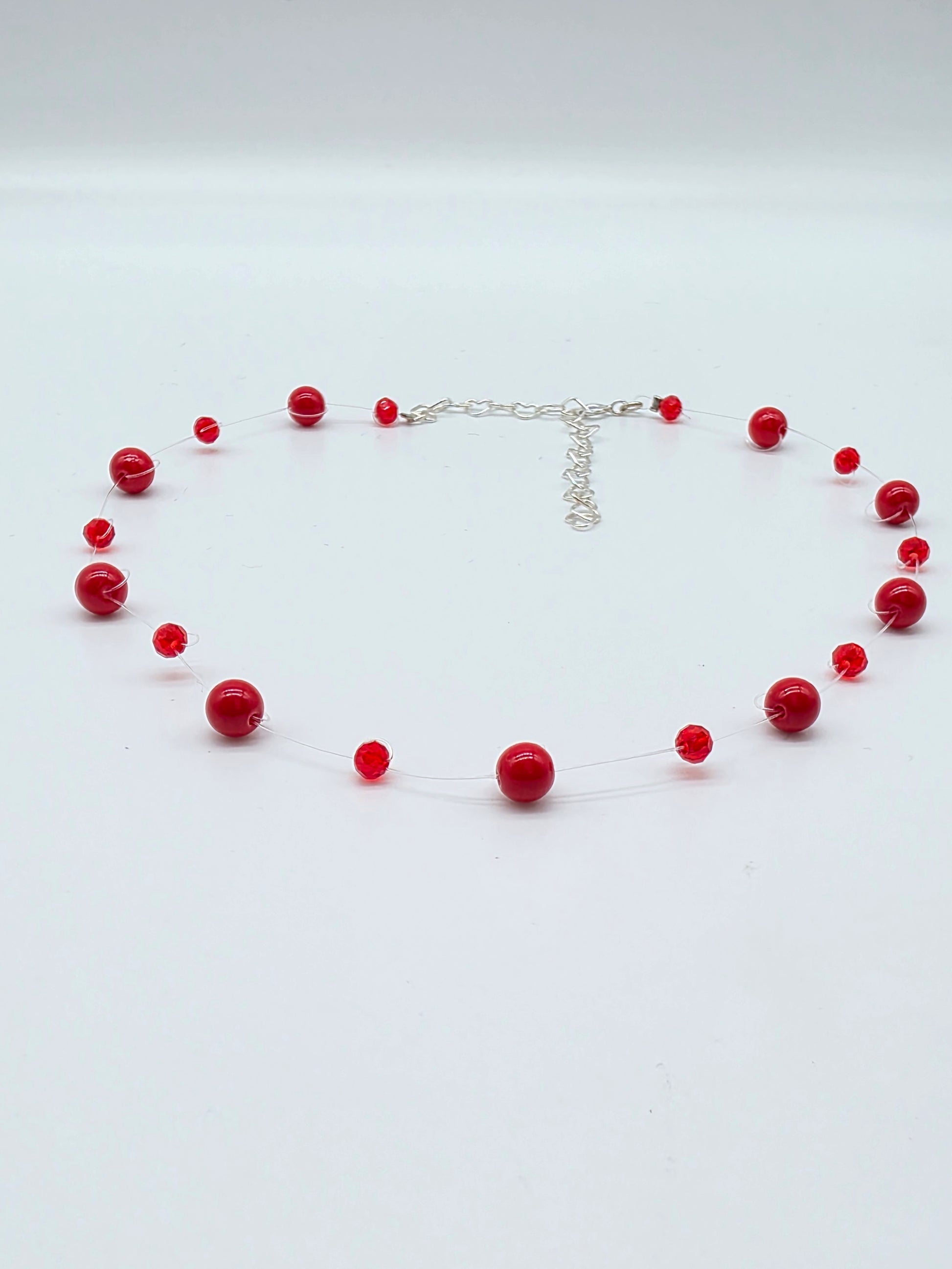 Detta eleganta halsband har en modern floating design med röda stenar (ca 4,5 mm) och facetterade kristaller som ger en vacker lyster.