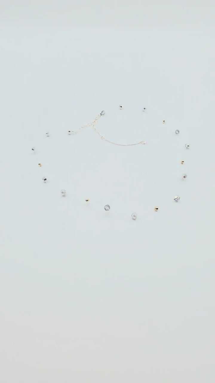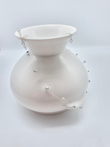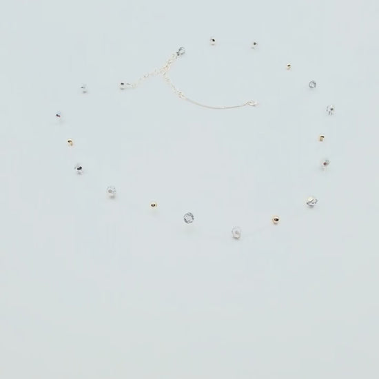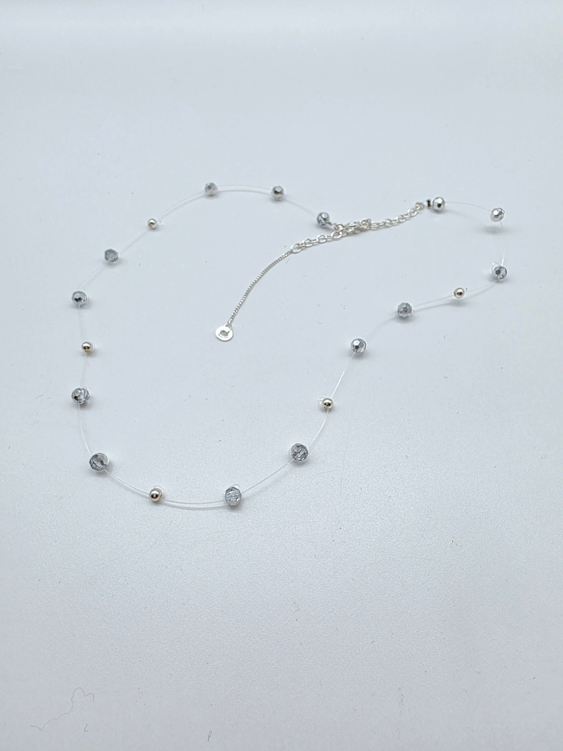 Detta eleganta halsband har en modern floating design där skimrande glaskristaller kombineras med silverkulor.