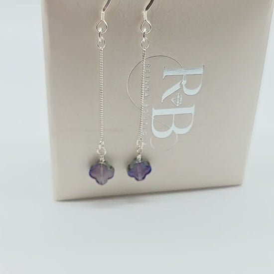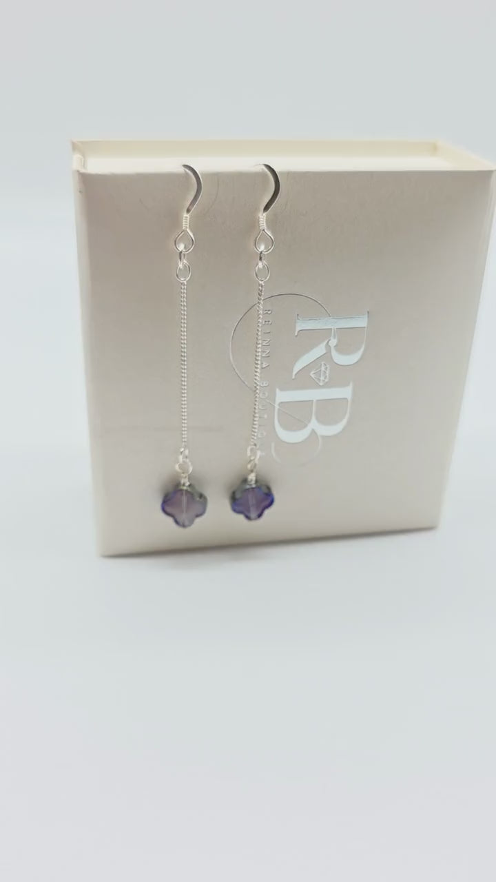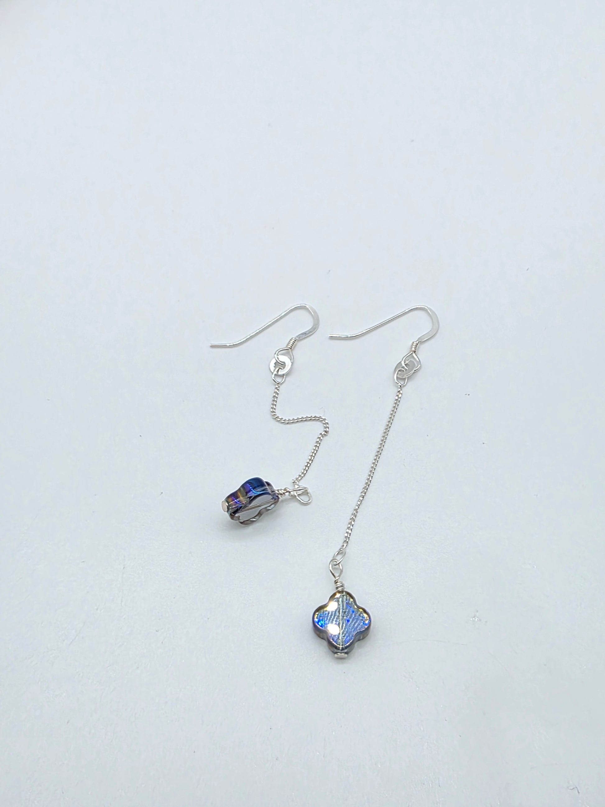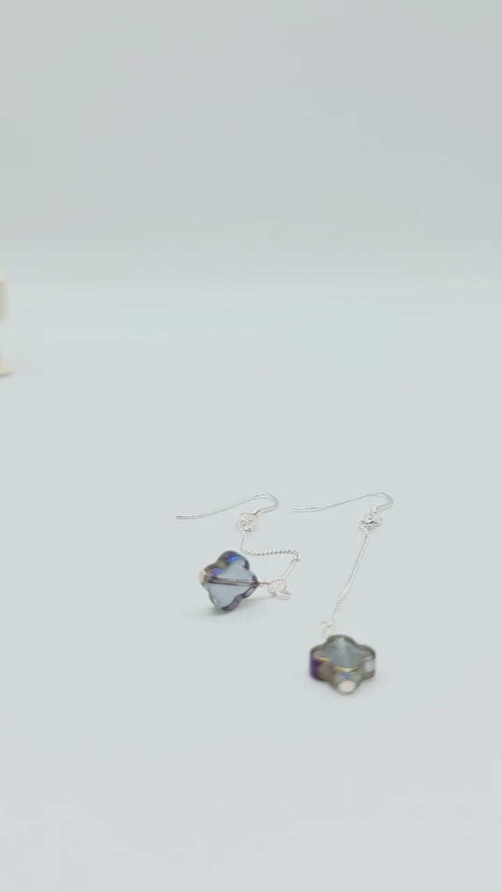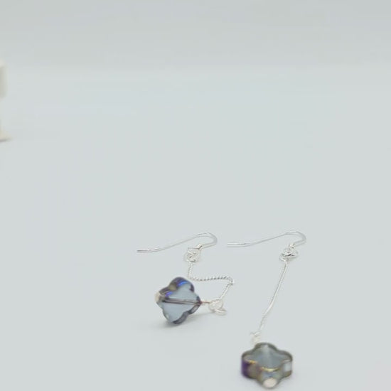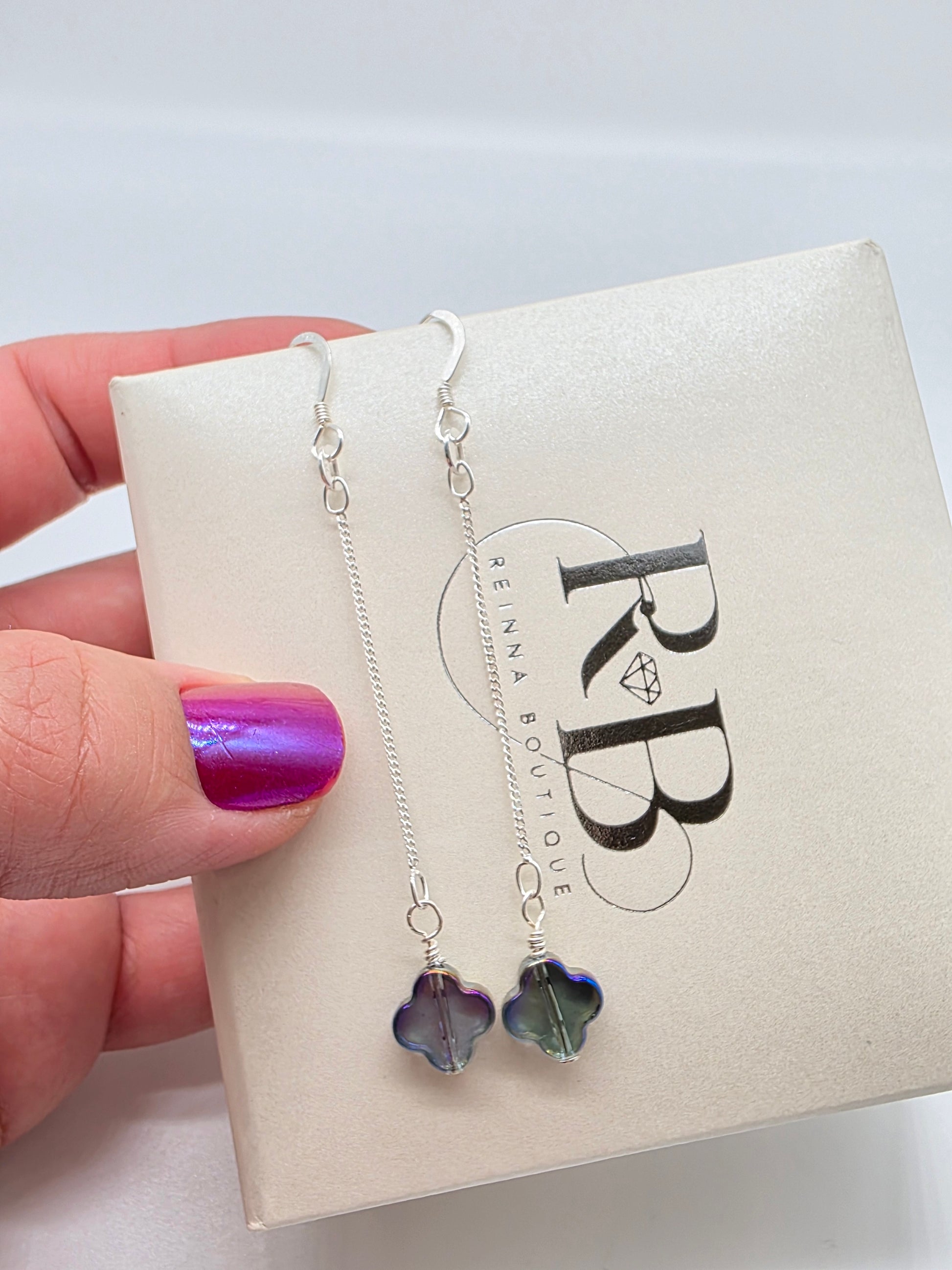 Varje örhänge pryds med en skimrande fyrklöverformad detalj i iriserande glas som skiftar vackert i färg beroende på ljuset – subtilt men iögonfallande ✨