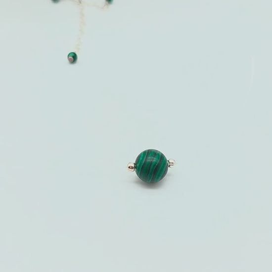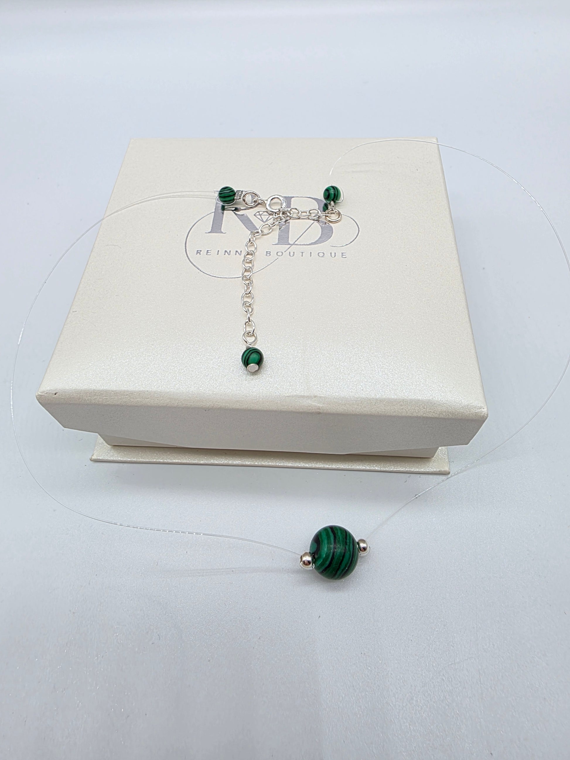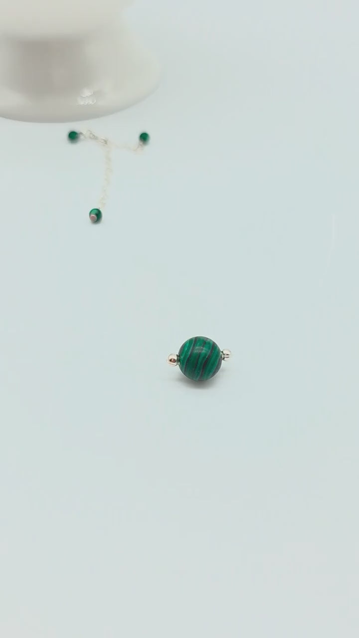 Detta eleganta halsband har en modern floating design med en central kula i malakit, omgiven av två silverkulor i silver 925.