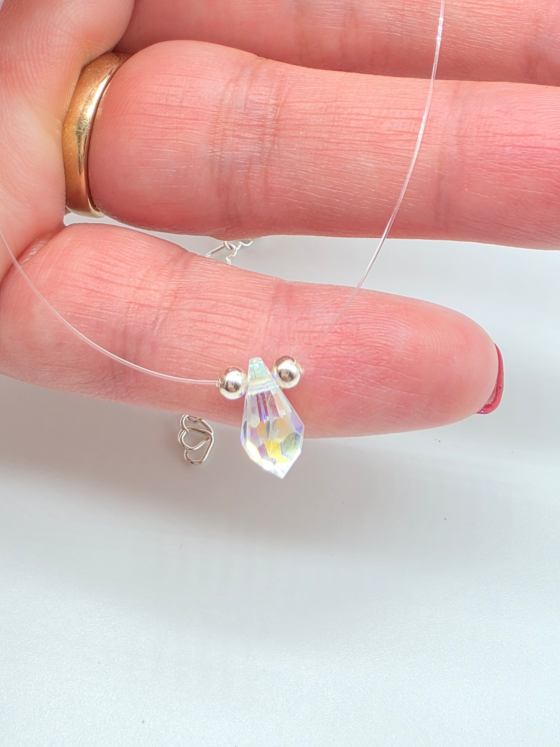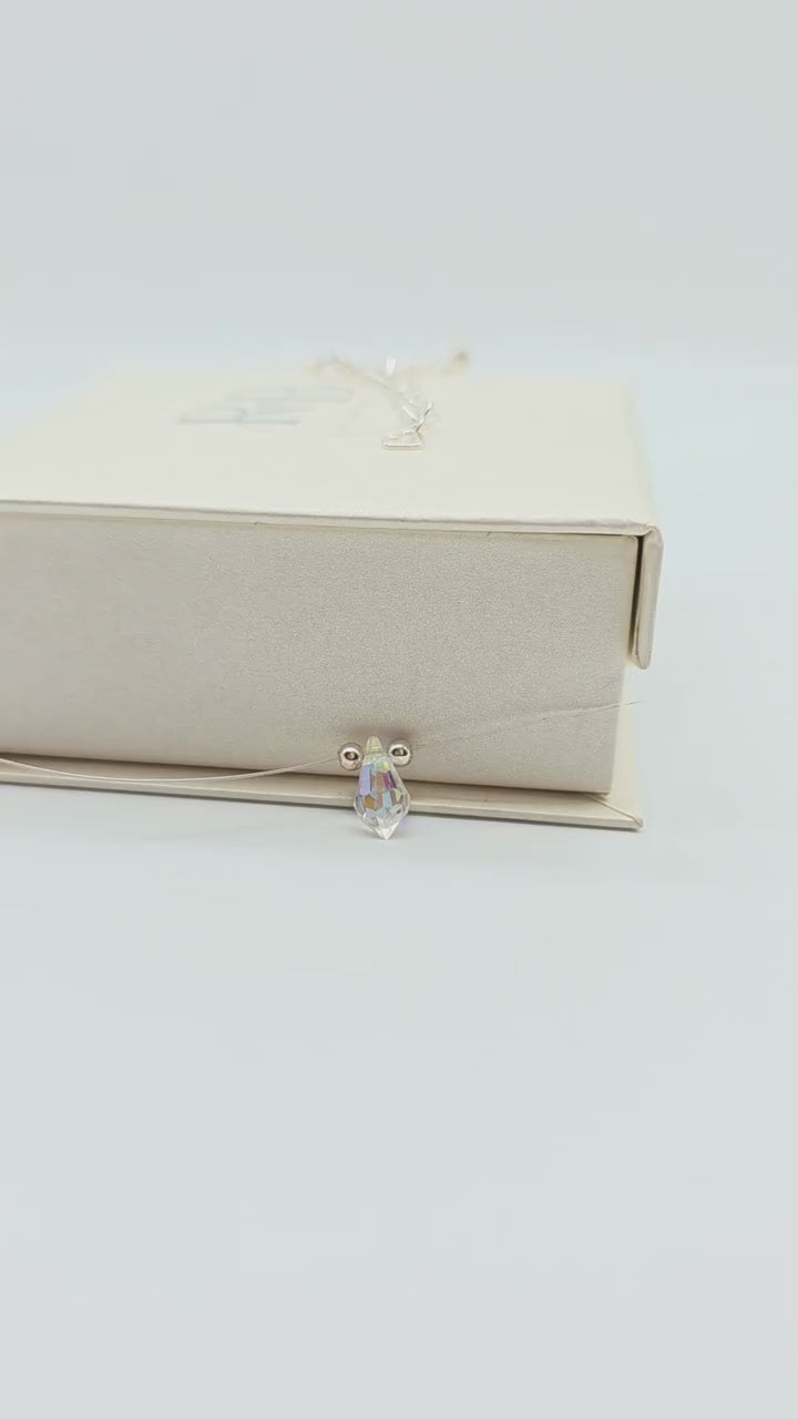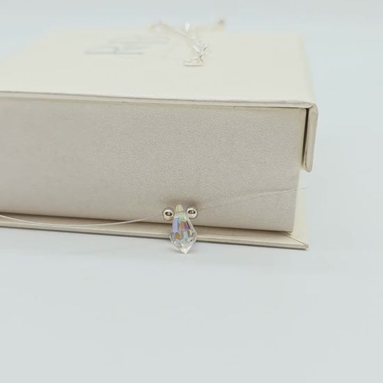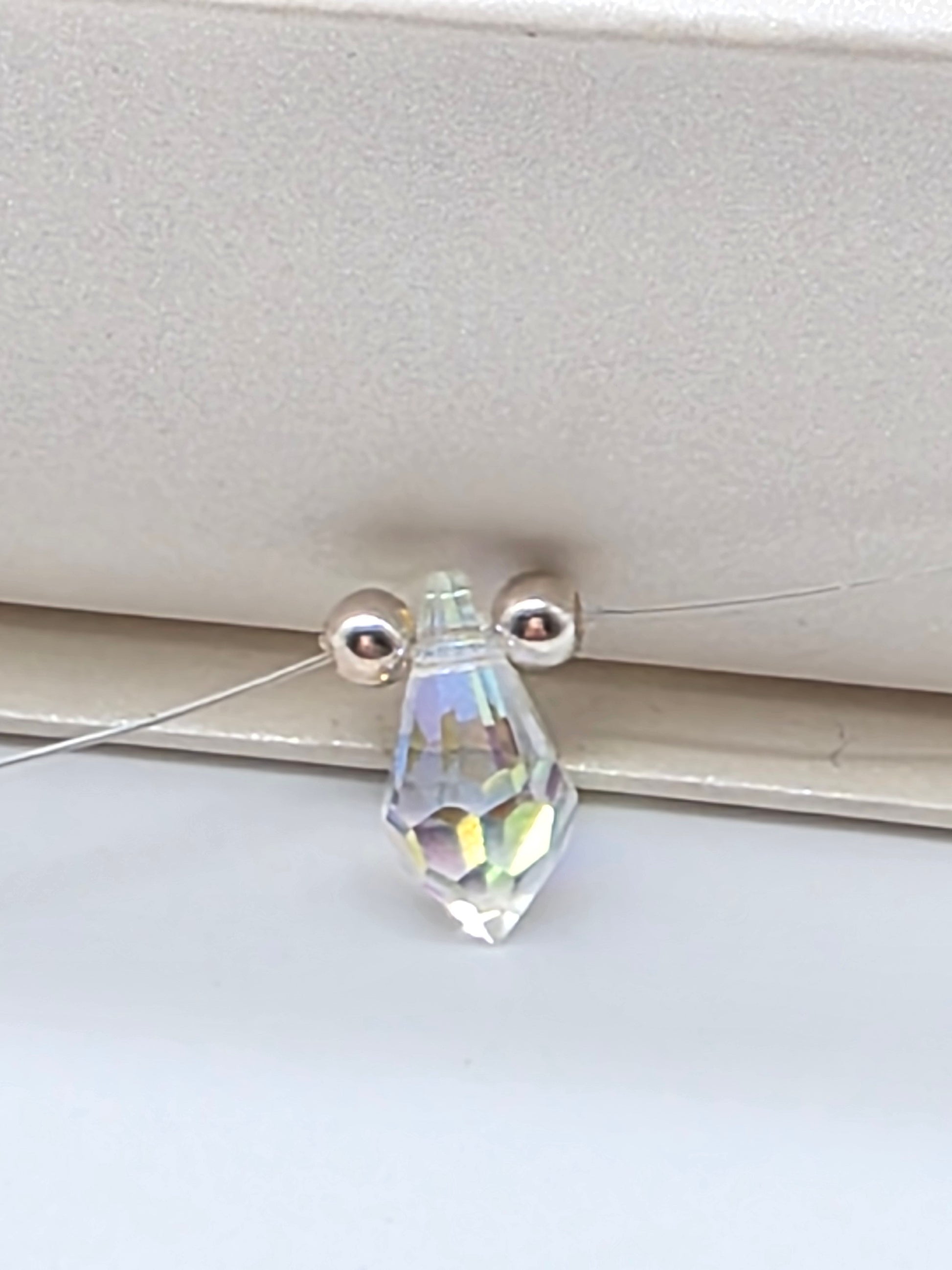 Detta handgjorda halsband har en elegant floating design, där en klar, facetterad kristall i droppform lyfts fram mellan två silverkulor i silver 925 ✨